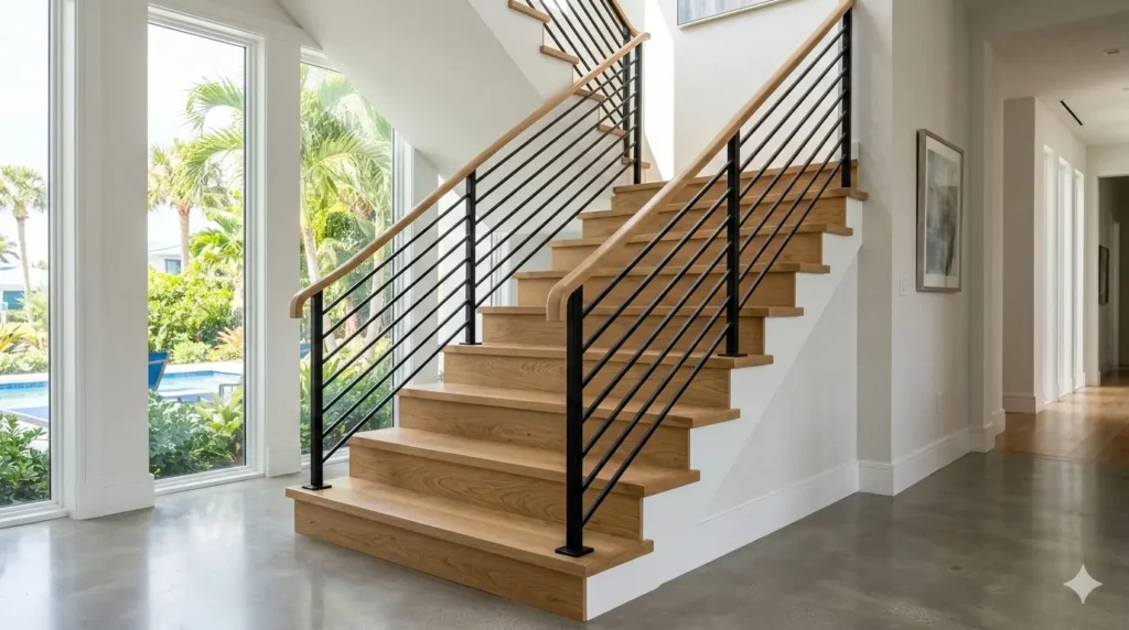 White oak is one of the best-performing hardwoods in Florida environments due to its density and moisture resistance. It remains a premium choice for custom staircases and high-end trim projects.